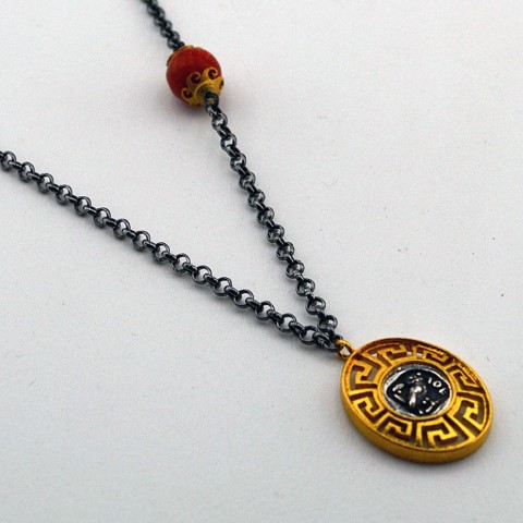 Κολιέ από ασημένια αλυσίδα 925 με μαύρο επιπλατίνωμα. Μοτίβο σε τρία σχέδια από μαίανδρο με ματ επιχρύσωση και ασήμι πατιναρισμένο το εσωτερικό στοιχείο. Πέτρα από κοράλλι ή λάπις,ή μαργαριταράκι γλυκού νερού. Τα στοιχεία είναι παρμένα από την ιστορία της Αρχαίας Ελλάδας.