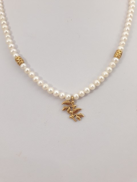 Κολιέ από ΜΑΡΓΑΡΙΤΑΡΙ γλυκού νερού, στο γλυκό χρώμα της πέρλας, με στοχεία και μοτιφ από ασήμι 925 και διπλή επιχρύσωση από χρυσό 24 καρατίων.