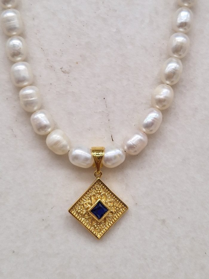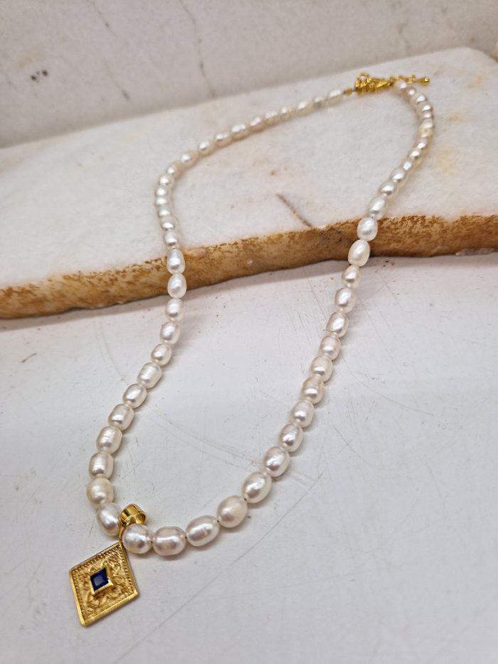 Κολιέ με βυζαντινό στοιχείο ρόμβο από επίχρυσο ασήμι 925 και πολύχρωμο κρύσταλλο στο κέντρο του, δεμένο με λευκά μαργαριτάρια λίμνης.