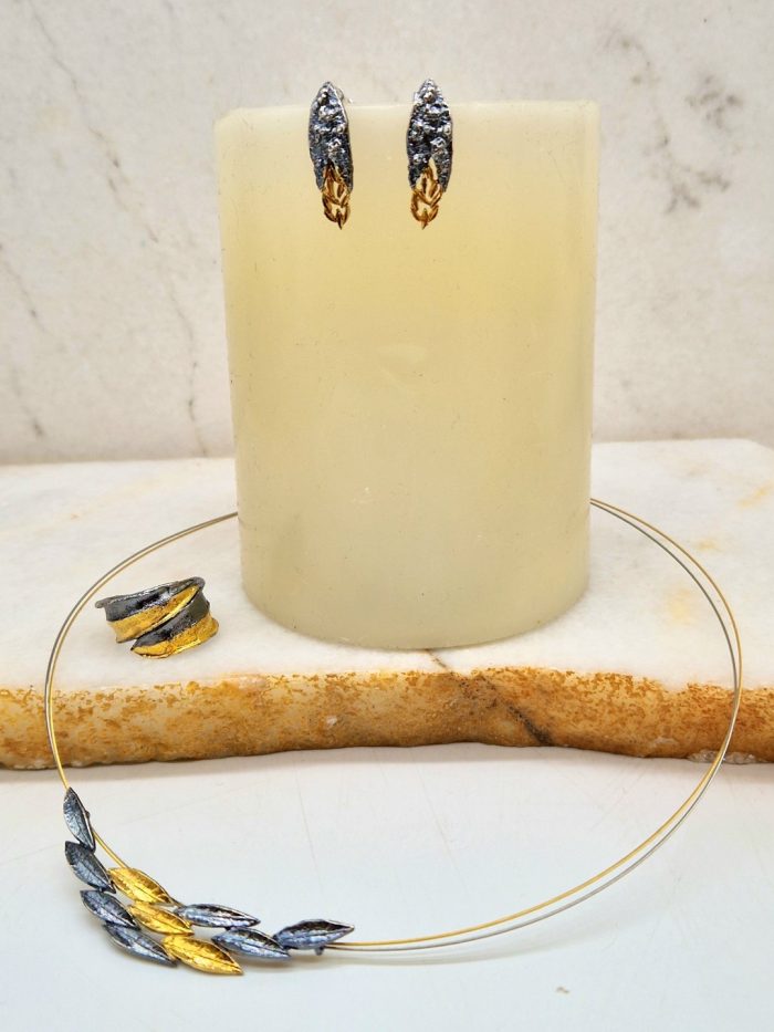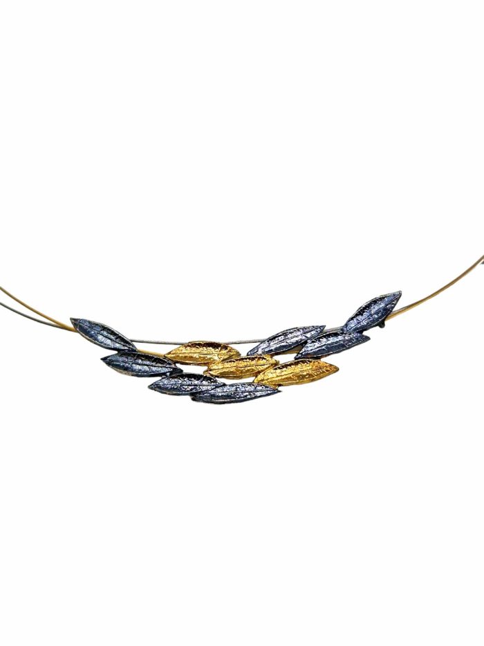 Κοντό κολιέ με μοτίβο από φύλλα ελιάς σε επίχρυσο ασήμι και σε μαύρη επιροδίωση, δεμένο με επίχρυσο ατσαλόσυρμα το οποίο περιβάλλει απαλά το λαιμό χωρίς να ενοχλεί καθόλου.