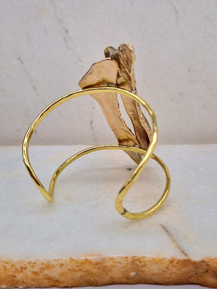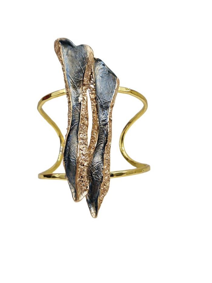 Βραχιόλι από ορείχαλκο, με δύο ενωμένα μοτίβα σε χρυσαφί και γκρι σκούρο χρώμα. Το κόσμημα έχει υποστεί επεξεργασία διαμανταρίσματος που του προσδίδει ιδιαίτερες λάμψεις και είναι εμβαπτισμένο σε ειδικά βερνίκια ώστε να μην αλλοιώνεται ποτέ.