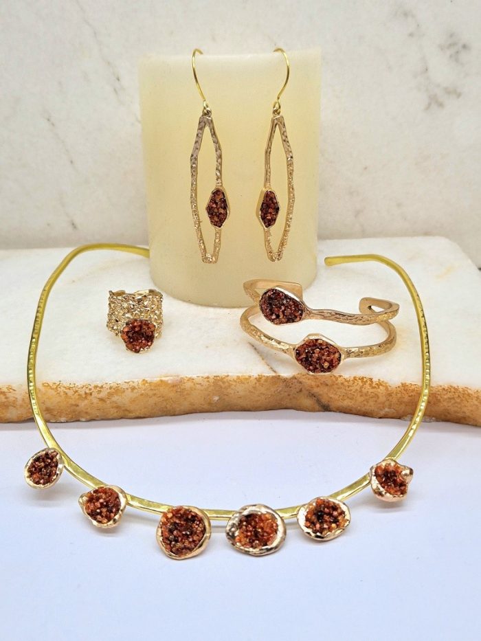 Βραχιόλι από ορείχαλκο, σκαλιστό, σε χρυσαφί χρώμα και δύο μοτίβα με ορυκτούς κρυστάλλους στο χρώμα της κανέλας.Το κόσμημα έχει υποστεί επεξεργασία διαμανταρίσματος που του προσδίδει ιδιαίτερες λάμψεις και είναι εμβαπτισμένο σε ειδικά βερνίκια ώστε να μην αλλοιώνεται ποτέ.