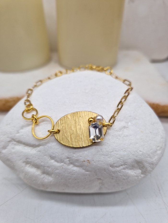 Βραχιόλι με μοτίβο από ορείχαλκο σε χρυσαφί ή μαύρο χρώμα, πέτρα από κρύσταλλο και αλυσίδα από ατσάλι .