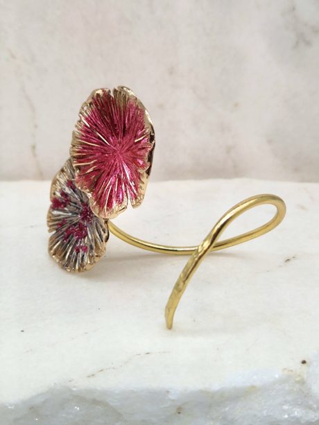 Βραχιόλι με χοντρή ορειχάλκινη βέργα που από τη μία μεριά καταλήγει σε δύο μοτίβα από ορείχαλκο σαν λουλούδια, πατιναρισμένα με γκρι και κερασί χρώμα,