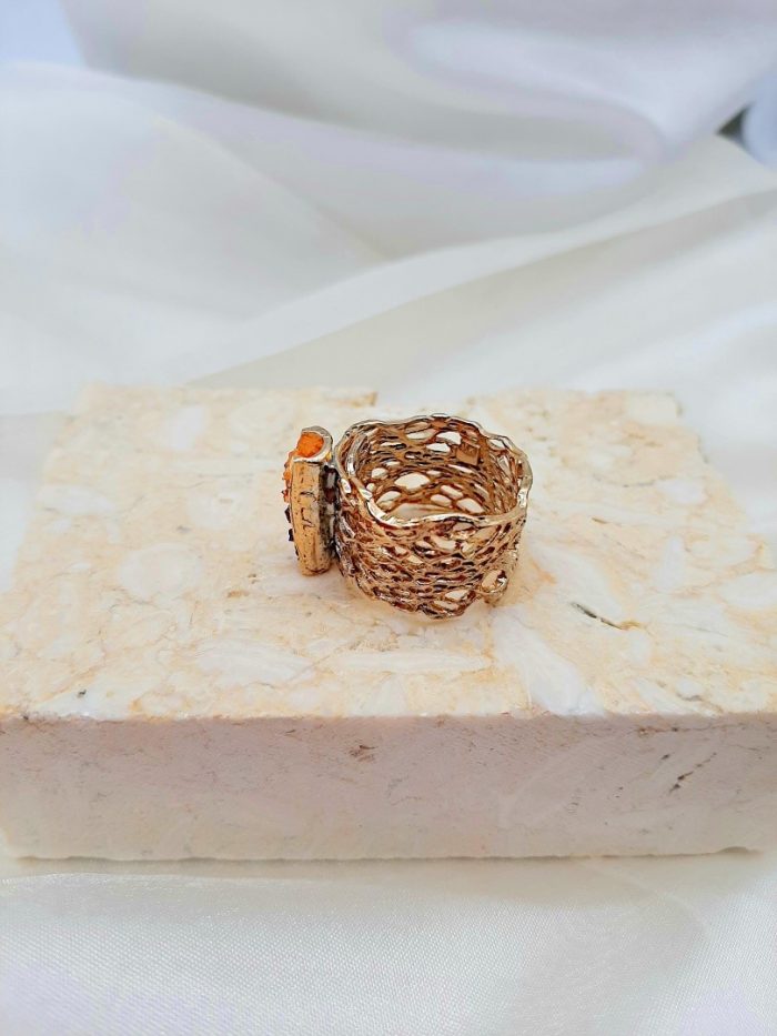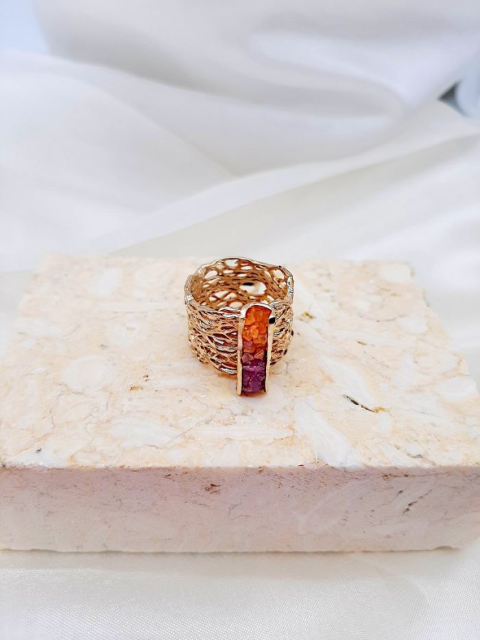 Χειροποίητο δαχτυλίδι με μοτίβο από ορείχαλκο σαν δίχτυ σε χρυσαφί πατίνα και επεξεργασία διαμανταρίσματος για να του προσδίδει ιδιαίτερες λάμψεις και κρυστάλλους σε μωβ και πορτοκαλί χρώμα.