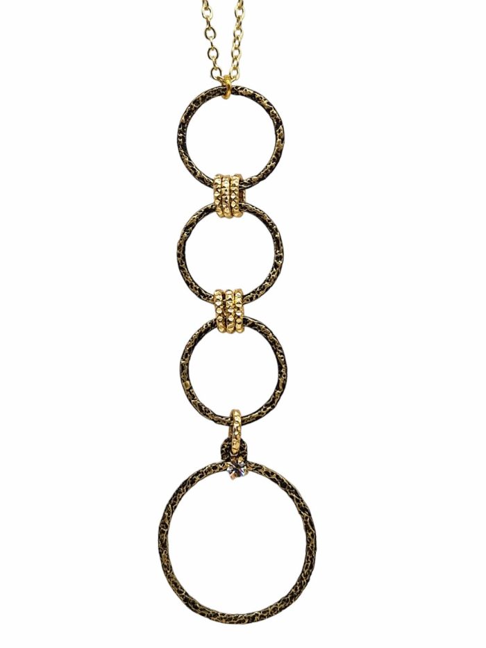 Κολιέ με τέσσερις στη σειρά κρίκους από ορείχαλκο σε διχρωμία μαύρο με χρυσό,κρυστάλλινη πέτρα, και χρυσαφί αλυσίδα από ατσάλι.