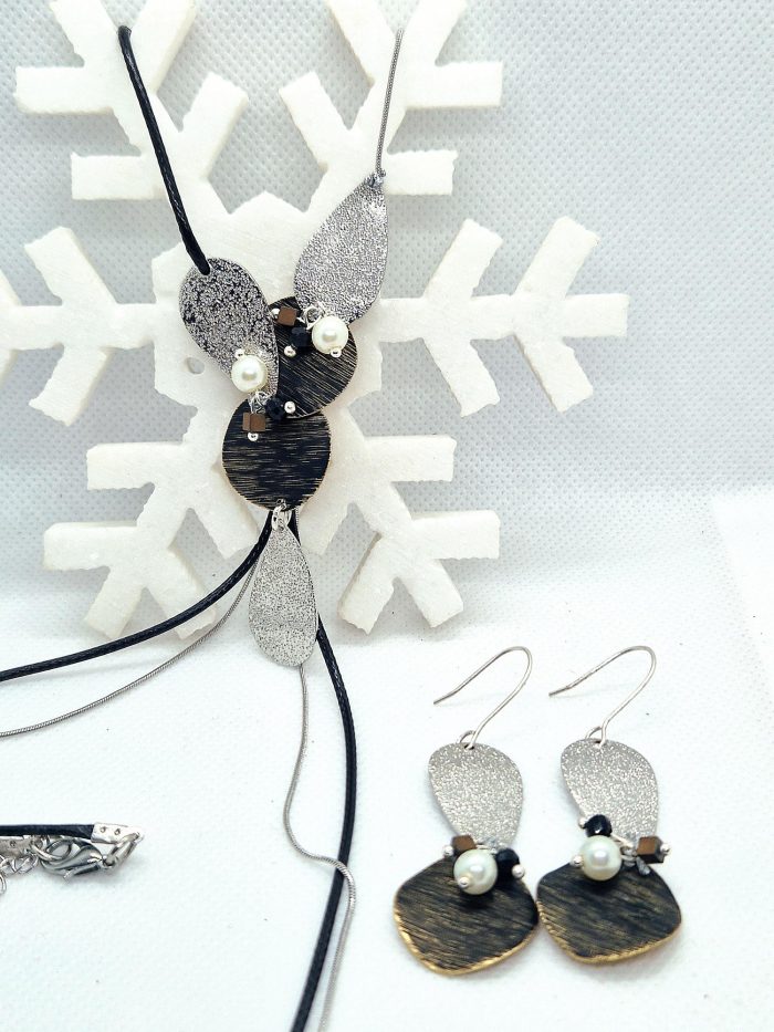 Κολιέ με ασημί μεταλλικά φύλλα που συνδυάζονται με στρογγυλούς, χρυσούς, μεταλλικούς δίσκους πατιναρισμένους με μαύρο χρώμα και διάφορες χάντρες, δεμένα μεταξύ τους με ατσάλινη, ασημί αλυσίδα και γυαλιστερό μαύρο κορδόνι .