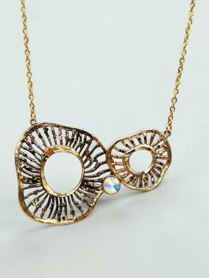 Κολιέ με δύο ορειχάλκινα, σφυρήλατα μοτίβο, εμπνευσμένα από τον κόσμο των λουλουδιών διακοσμημένα με δύο χρώματα πατίνας και ένα λαμπερό κρύσταλλο. Η επιφάνεια του ορείχαλκου έχει δουλευτεί σχολαστικά στο χέρι με την εξαιρετικά απαιτητική τεχνική του διαμανταρίσματος, που προσδίδει στο κόσμημα ιδιαίτερες λάμψεις. Το κόσμημα ειναι δεμένο με αλυσίδα από ανοξείδωτο ατσάλι για μέγιστη αντοχή και υποαλλεργική προστασία.