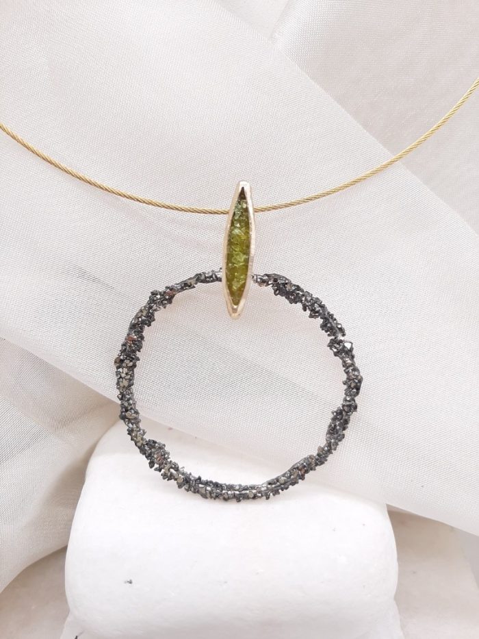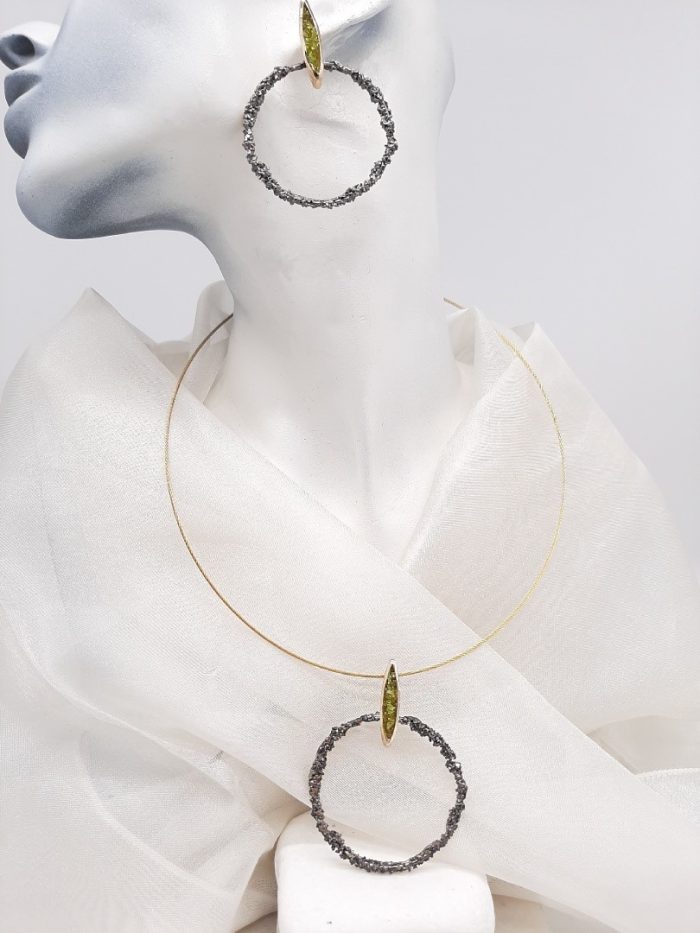 Κολιέ με ορειχάλκινο κρίκο σε μαύρη απόχρωση, μοτίβο με πράσινους κρυστάλλους, επεξεργασία διαμανταρίσματος που του προσδίδει ιδιαίτερες λάμψεις, δεμένο με επίχρυσο σύρμα από ατσάλι .