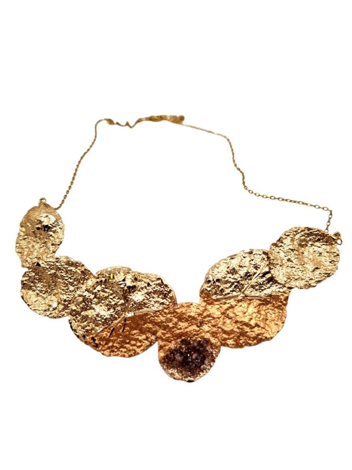 Κολιέ με έξι ορειχάλκινα σφυρήλατα μοτίβα ενωμένα, πατιναρισμένα με χρυσό και χάλκινο χρώμα και επεξεργασία διαμανταρίσματος που του προσδίδει ιδιαίτερες λάμψεις, δεμένα με αλυσίδα από ατσάλι. Την άκρη του ενός μοτίβου διακοσμούν καφέ ορυκτοί κρύσταλλοι.