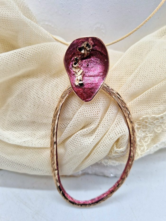 Κολιέ με ορειχάλκινο, σκαλιστό κρίκο που το εσωτερικό του είναι πατιναρισμένο με μωβ χρώμα και το επάνω μέρος του στολίζει μοτίβο με μωβ πατίνα επίσης. Το κόσμημα έχει υποστεί επεξεργασία διαμανταρίσματος που του προσδίδει ιδιαίτερες λάμψεις και είναι δεμένο με επίχρυσο σύρμα απο ατσάλι, που αγκαλιάζει μαλακά το λαιμό.
