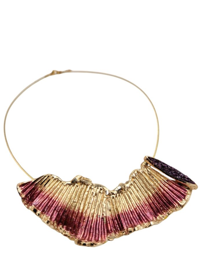 Κολιέ με ορειχάλκινο, σκαλιστό μοτίβο σαν κύμα σε χρώματα χρυσό και purple. Την άκρη του στολίζει μοτίβο με μωβ κρυστάλλους.Το κόσμημα έχει υποστεί επεξεργασία διαμανταρίσματος που του προσδίδει ιδιαίτερες λάμψεις και είναι δεμένο με επίχρυσο σύρμα απο ατσάλι, που αγκαλιάζει μαλακά το λαιμό.