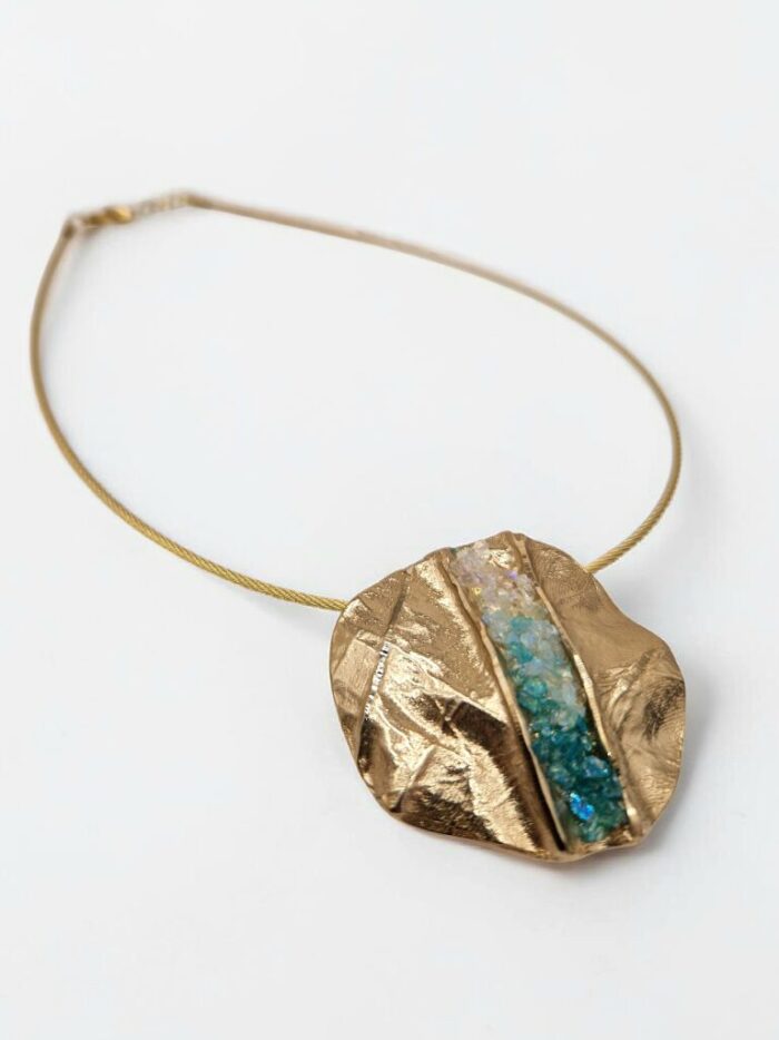 Κολιέ με ορειχάλκινο σφυρήλατο μοτίβο διακοσμημένο με τυρκουάζ και άσπρα ακατέργαστα κρύσταλλα. Η επιφάνεια του ορείχαλκου έχει δουλευτεί σχολαστικά στο χέρι με την εξαιρετικά απαιτητική τεχνική του διαμανταρίσματος, που προσδίδει στο κόσμημα ιδιαίτερες λάμψεις. Το κόσμημα είναι δεμένο με λαιμαριά από μαλακό σύρμα από ανοξείδωτο ατσάλι (το οποίο αγκαλιάζει απαλά το λαιμό,) για μέγιστη αντοχή και υποαλλεργική προστασία.
