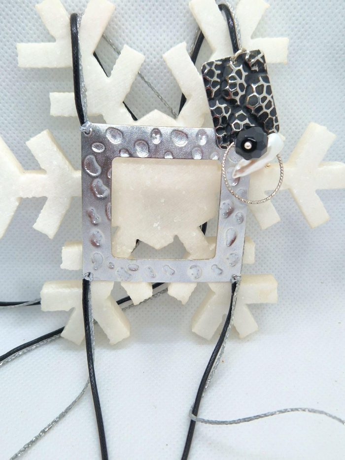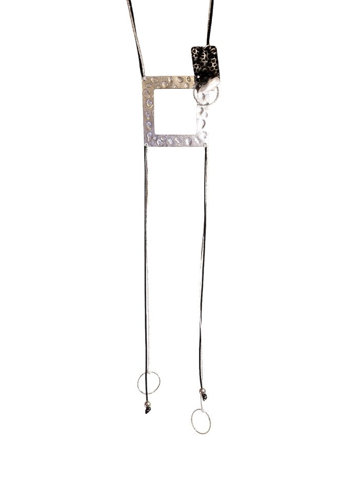 Κολιέ με τετράγωνο ορειχάλκινο μοτίβο σε ασημί ή χρυσαφί απόχρωση, σφυρήλατα ορειχάλκινα μέταλλα σε ανάλογη απόχρωση και διάφορες γυάλινες χάντρες, δεμένα μεταξύ τους με υψηλής ποιότητας κορδόνια σε ανάλογους χρωματισμούς.