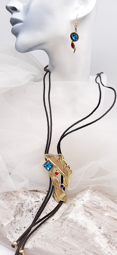 Μακρύ κολιέ με ορείχαλκο εικαστικής σχεδίασης δεμένο με μπλε και κόκκινα κρύσταλλα preciosa και υψηλής ποιότητας καφέ κορδόνι.