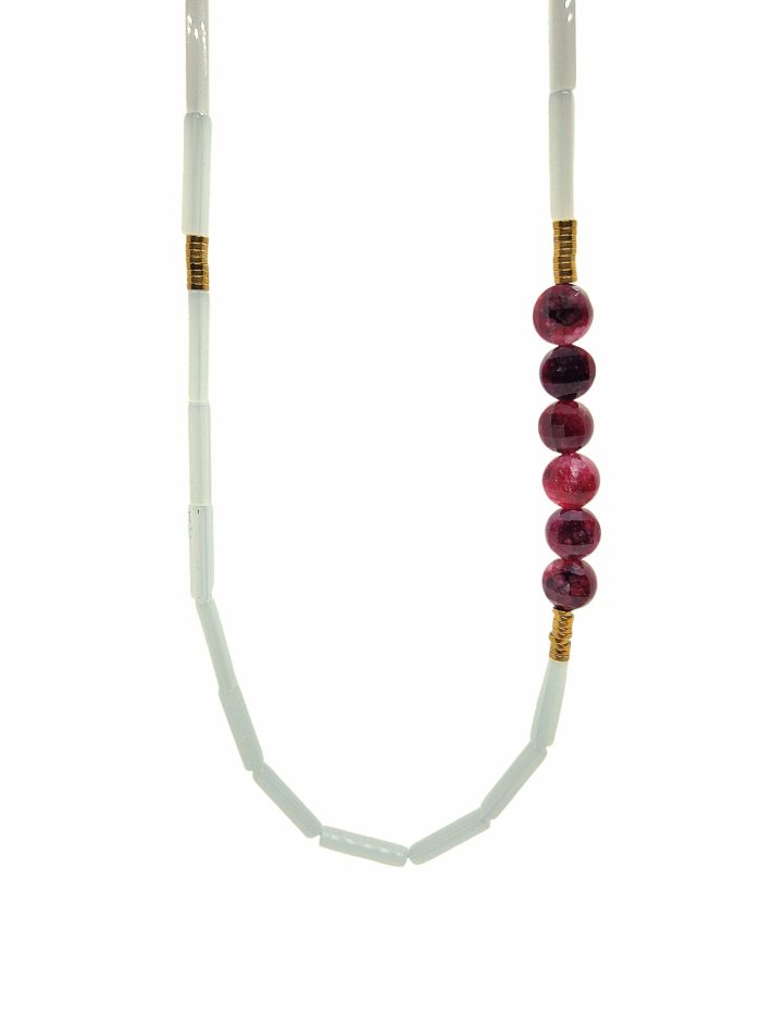 Χειροποίητο κολιέ με λευκά κρύσταλλα, δεμένα μεταξύ τους με μπορντό ορυκτές πέτρες Νεφρίτη και χρυσούς αιματίτες.