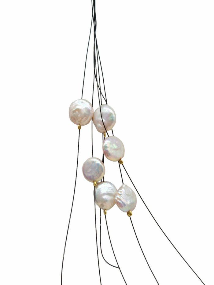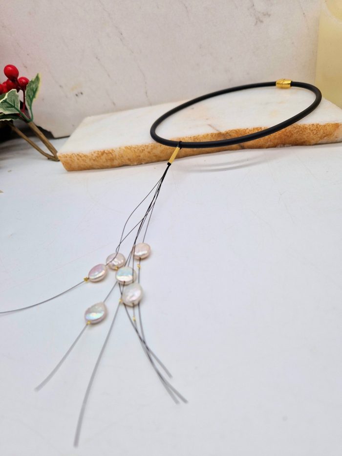 Κοντό κολιέ με έξι μαργαριτάρια λίμνης και χρυσό αιματίτη δεμένα μεταξύ τους με μαύρη χοντρή μεσινέζα, και μαλακό κορδόνι από μαύρο καουτσούκ το οποίο περιβάλλει απαλά το λαιμό και δεν ενοχλεί καθόλου. Το κούμπωμα είναι από ισχυρό, χρυσαφί μαγνήτη για να κουμπώνει εύκολα.