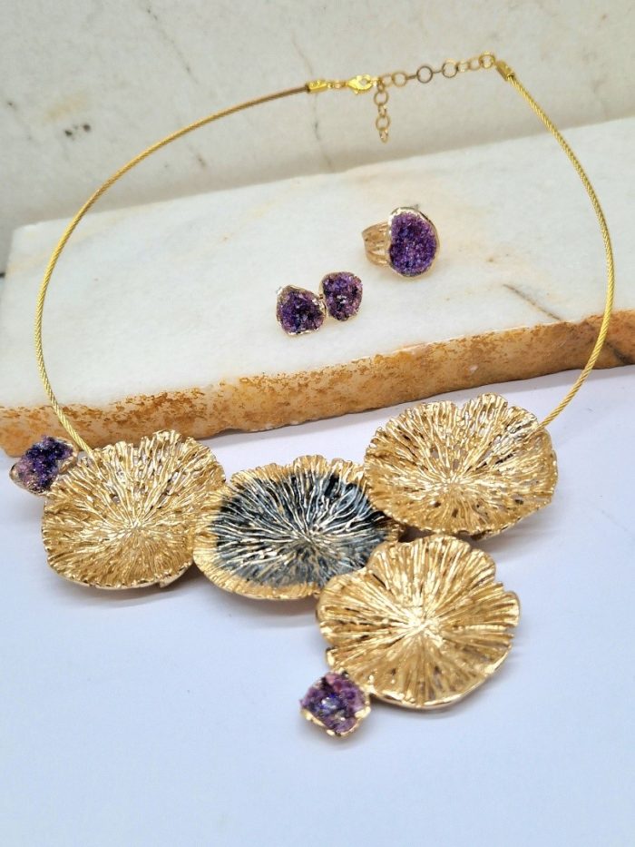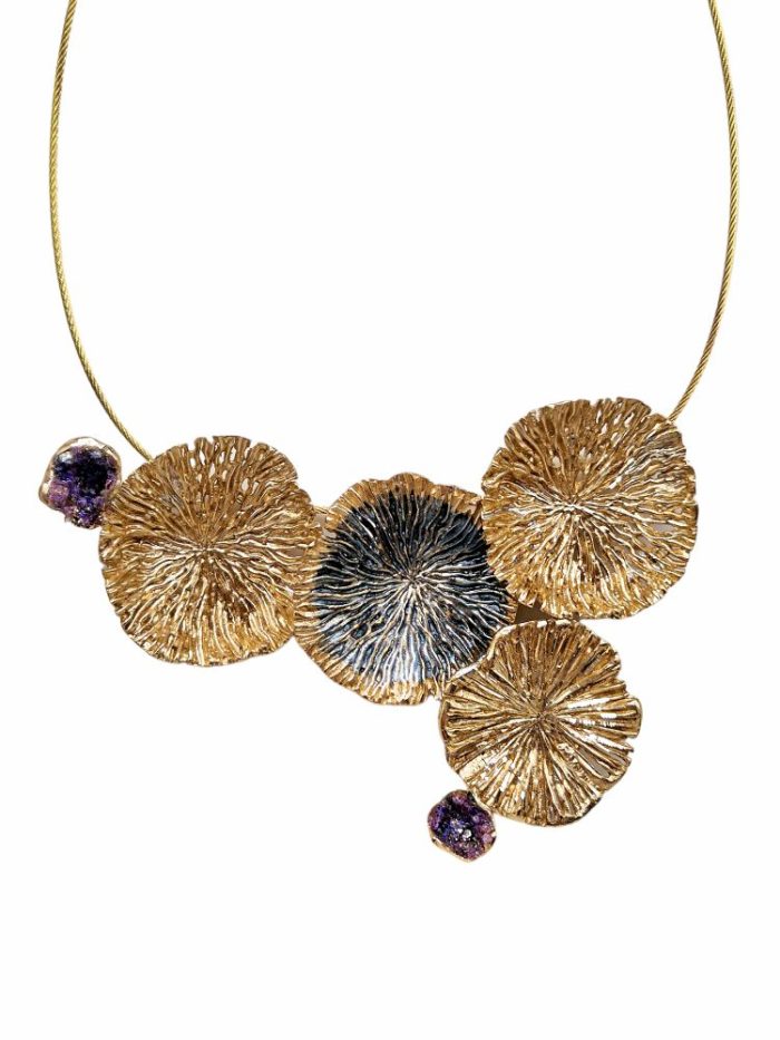 Κολιέ με μεγάλα ορειχάλκινα μοτίβα σαν λουλούδια σε χρυσαφί και γκρι-μαύρο χρώμα και δύο μικρά μοτίβα με μωβ ορυκτούς κρυστάλλους, δεμένα μεταξύ τους πιάνω σε χοντρό επίχρυσο ατσαλόσυρμα το οποίο αγκαλιάζει απαλά το λαιμό χωρίς να ενοχλεί και να πιέζει καθόλου. Τα μοτίβα έχουν υποστεί επεξεργασία διαμανταρίσματος που τους προσδίδει ιδιαίτερες λάμψεις και όλο το κόσμημα είναι εμβαπτισμένο σε ειδικά βερνίκια ώστε να μην αλλοιώνεται ποτέ.