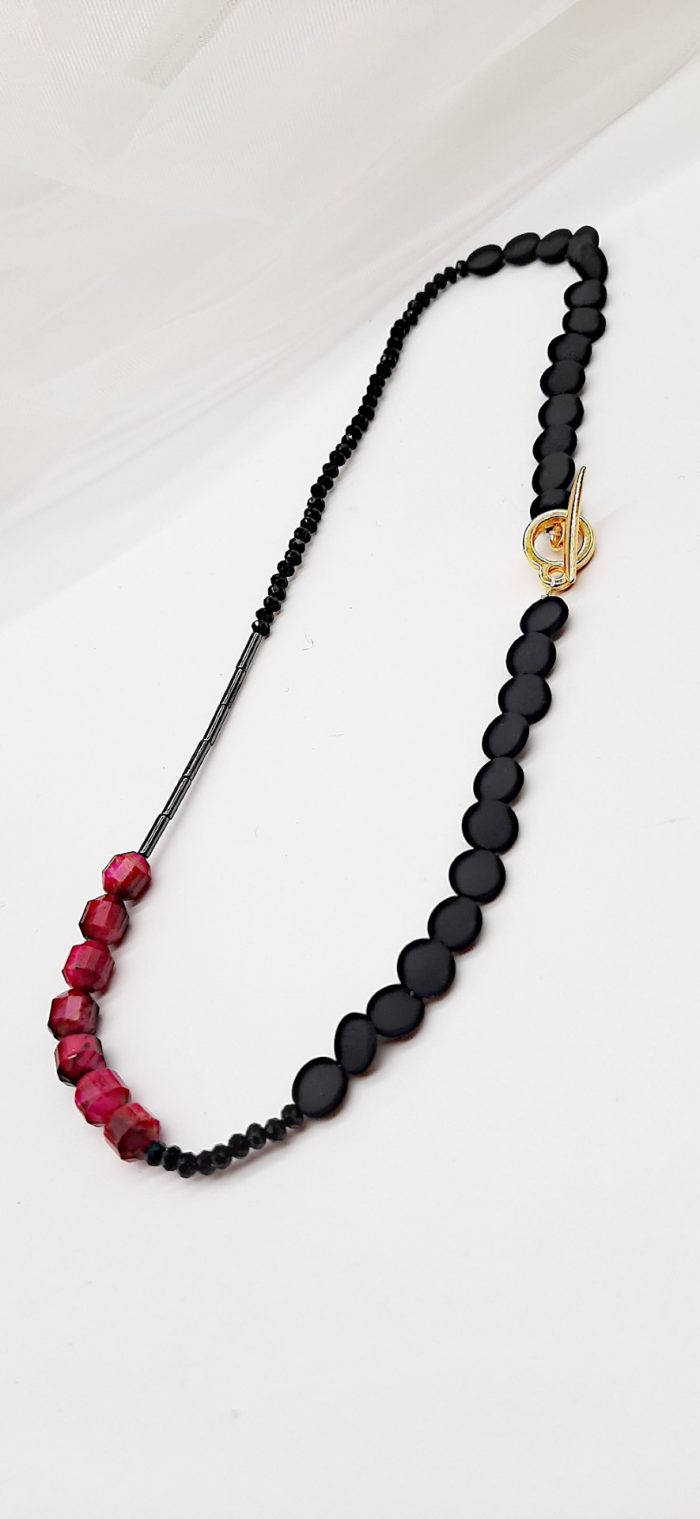 Κοντό κολιέ με ορυκτές πέτρες από γκρι και μαύρο αιματίτη, Μάτι της τίγρης σε φούξια χρώμα, και υψηλής ποιότητας μαύρα κρύσταλλα Τσεχίας.