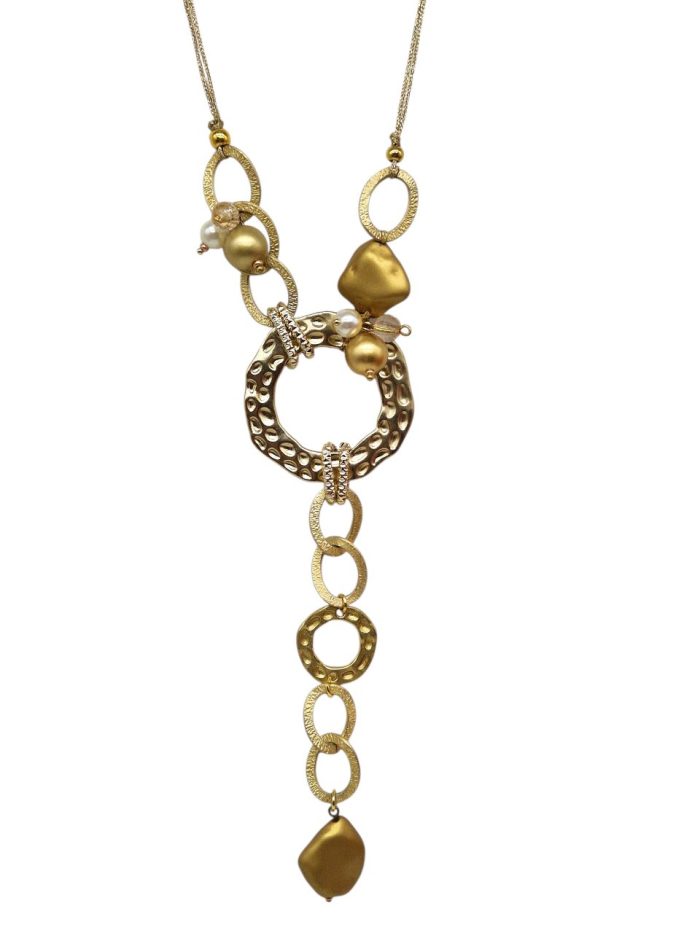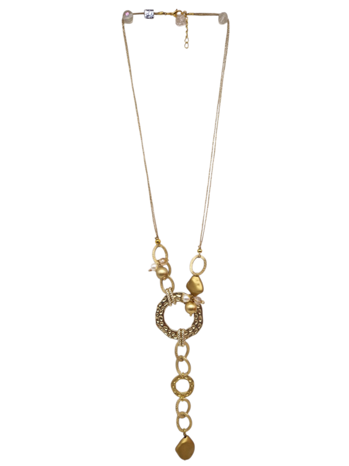 Χειροποίητο κολιέ με σφυρήλατους ορειχάλκινους κρίκους δεμένους μεταξύ τους με χρυσαφί κορδόνι και στολισμένους με διάφορες γυάλινες πέτρες σε χρυσό χρώμα.