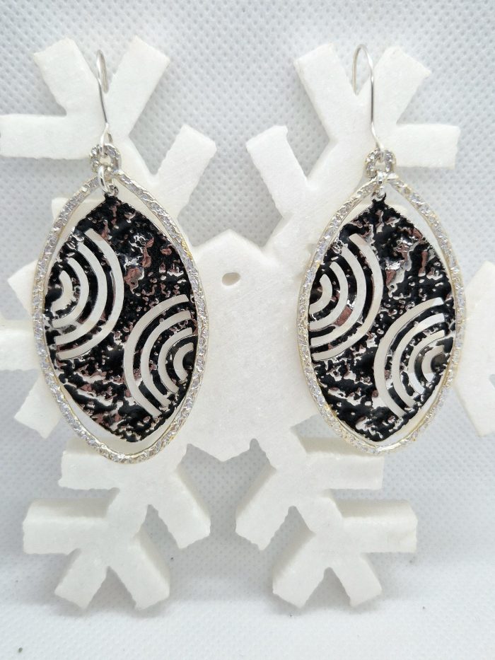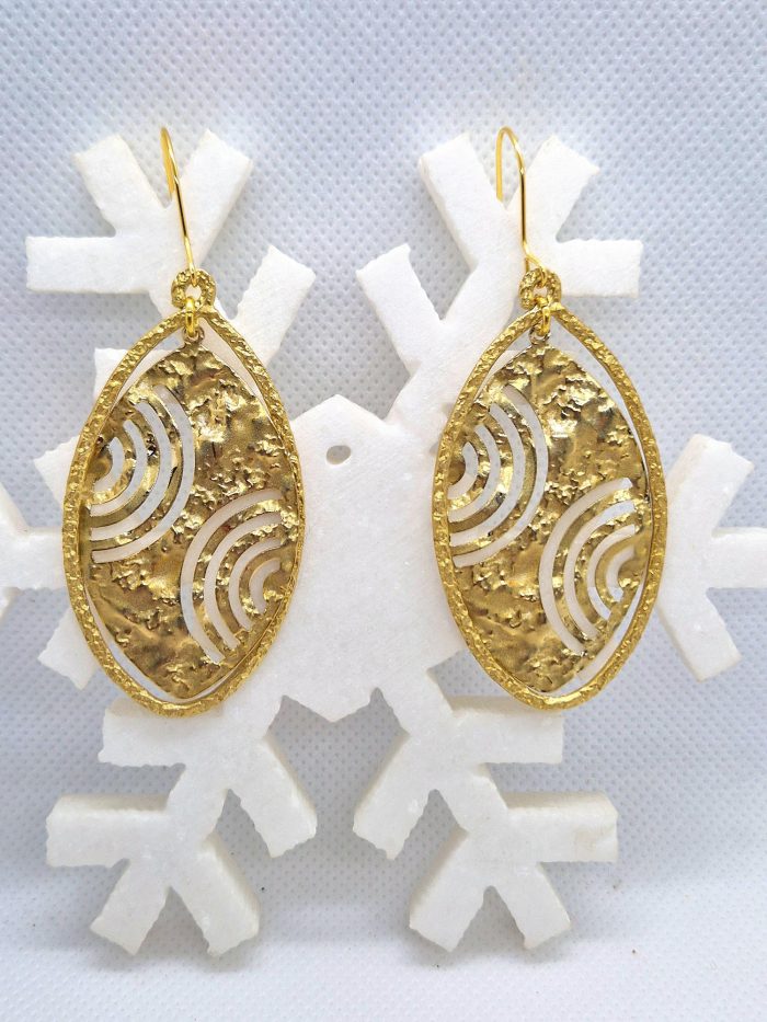 Σκουλαρίκια με οβάλ ορειχάλκινους κρίκους σε δύο χρώματα. Ασημί με μαύρο εσωτερικό μέταλλο και χρυσαφί με ίδιο χρώμα μέταλλο στο εσωτερικό του. Τα μέταλλα είναι από σφυρήλατο ορείχαλκο καθώς και ο γάντζος από τον οποίο κρεμιέται το σκουλαρίκι.