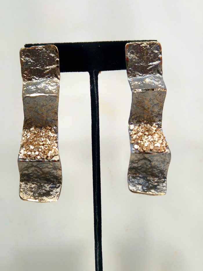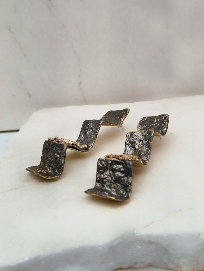 Σκουλαρίκια από ορειχάλκινα, σφυρήλατα μοτίβα σε σχήμα τεθλασμένης γραμμής, πατιναρισμένα με σκούρα πατίνα, στολισμένα με κρύσταλλα champagne, καρφωτά στο αυτί με pin από ασήμι 925.