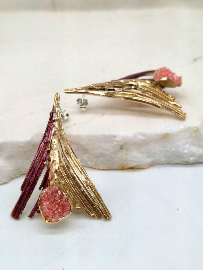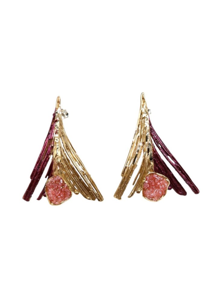 Σκουλαρίκια από ορείχαλκο με σκαλιστό δίχρωμο μοτίβο σαν φτερό πάνω στο οποίο υπαρχει μικρό μοτίβο με ρόζ κρυστάλλους. Το κόσμημα είναι σκαλισμένο με διαμάντι που του προσδίδει ιδιαίτερες λάμψεις και παραμένει αναλλοίωτο στο χρόνο καθώς έχει εμβαπτιστεί σε ειδικά βερνίκια.