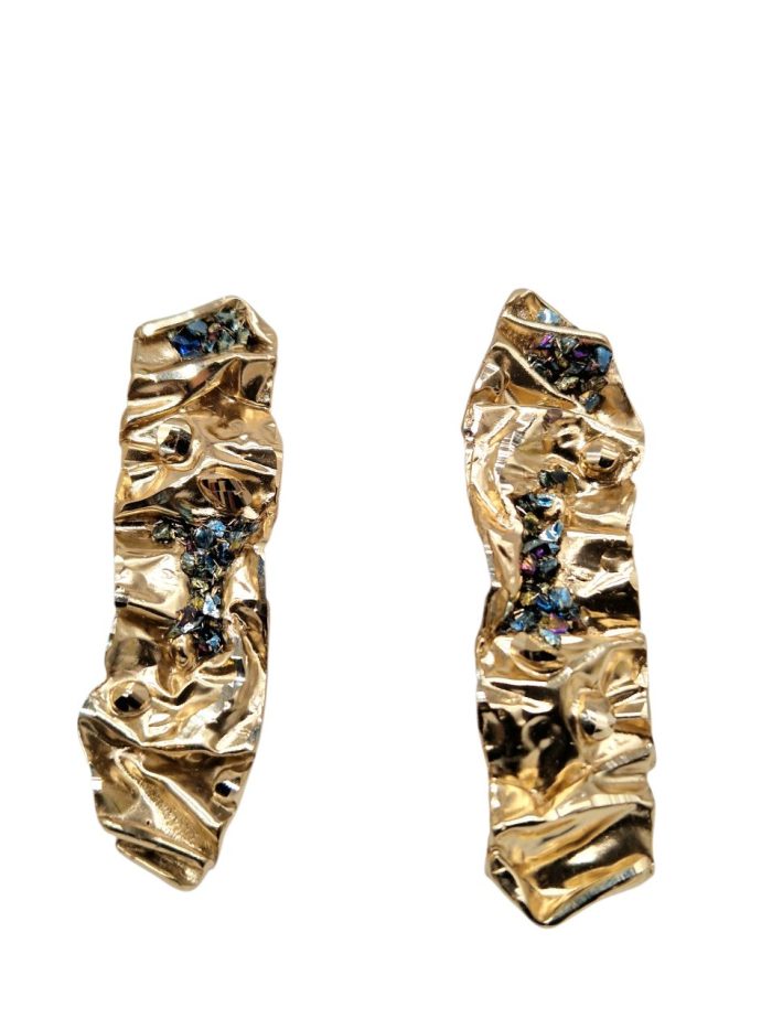 Σκουλαρίκια από ορείχαλκο με μοτίβο σαν τσαλακωμένο χαρτί, διακοσμημένο με κρύσταλλα λαμπραδορίτη. Το κόσμημα είναι σκαλισμένο με διαμάντι που του προσδίδει ιδιαίτερες λάμψεις και παραμένει αναλλοίωτο στο χρόνο καθώς έχει εμβαπτιστεί σε ειδικά βερνίκια. Κούμπωμα καρφωτό στο αφτί με καρφί από ασήμι 925.