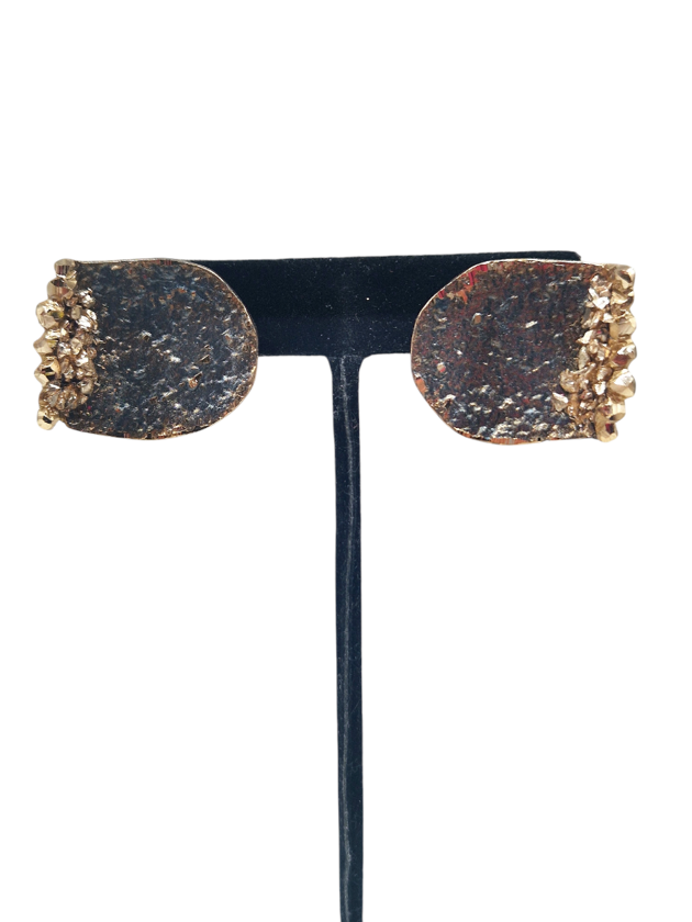 Κοντά σκουλαρίκια από σφυρήλατο ορειχάλκο σε σκούρα πατίνα, διακοσμημένα με ορυκτά κρύσταλλα champagne. Καρφωτά στο αυτί με ασημένιο pin.
