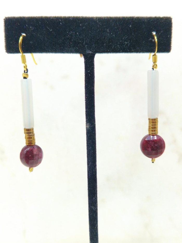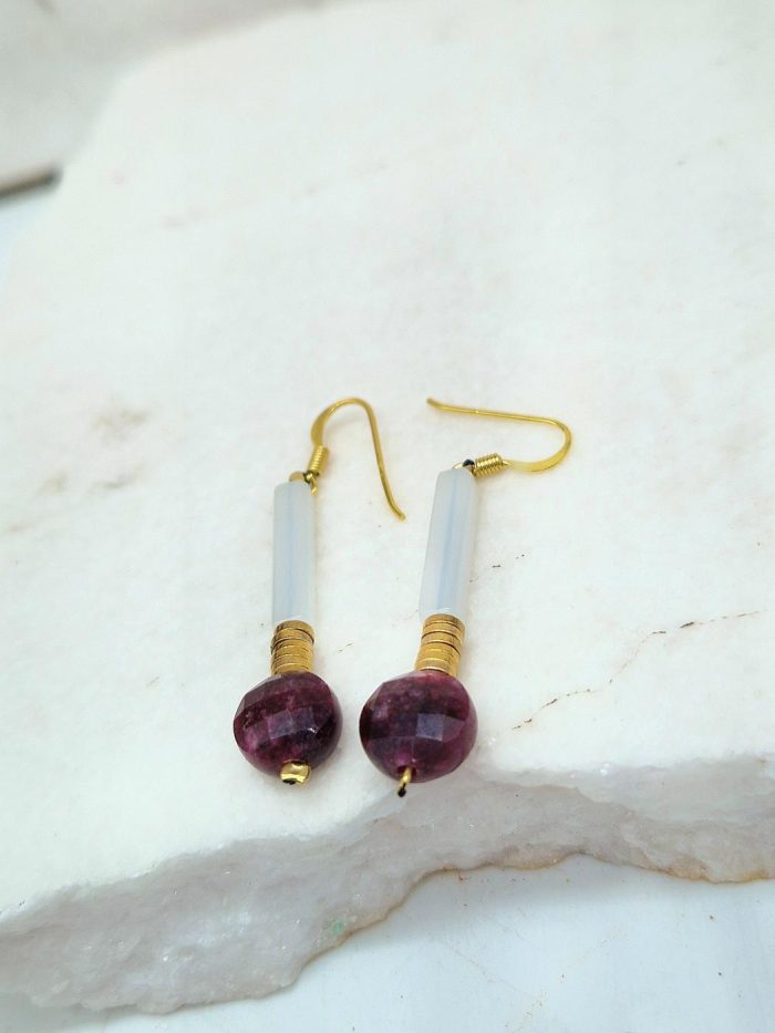 Σκουλαρίκια με λευκό κρύσταλλο χρυσό αιματίτη και ορυκτή πετρα από γκρενά γρανάτη, (πέτρα της υγείας).Κρεμαστά στο αυτί με ασημένιο-επίχρυσο γάντζο.