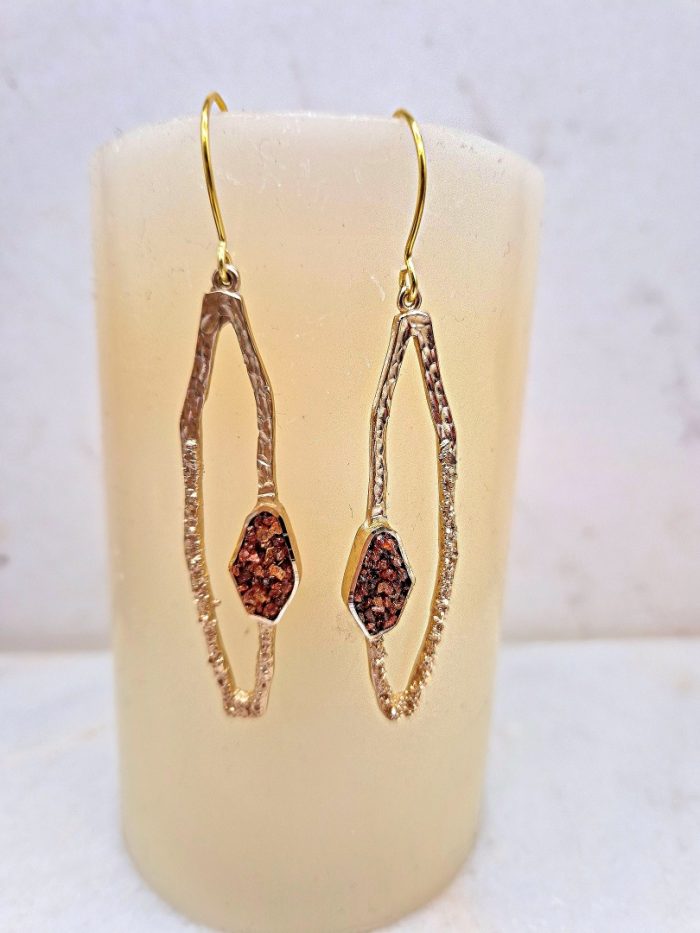 Μακριά σκουλαρίκια από ορειχάλκινο ,σκαλιστό μοτίβο με χρυσή πατίνα, μοτίβο με κανελί ορυκτούς κρυστάλλους, δεμένα με ασημένιους – επίχρυσους, μικρούς κρίκους που εφαρμόζουν απαλά σε τρυπημένο αυτί.