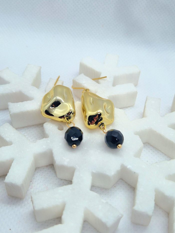 Σκουλαρίκια με χρυσαφί ακρυλικό στοιχείο και μαύρη γυάλινη χάντρα κρεμαστά στο αυτί με γάντζο από ορείχαλκο.