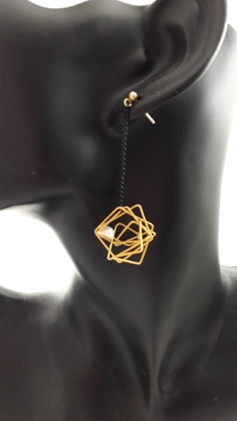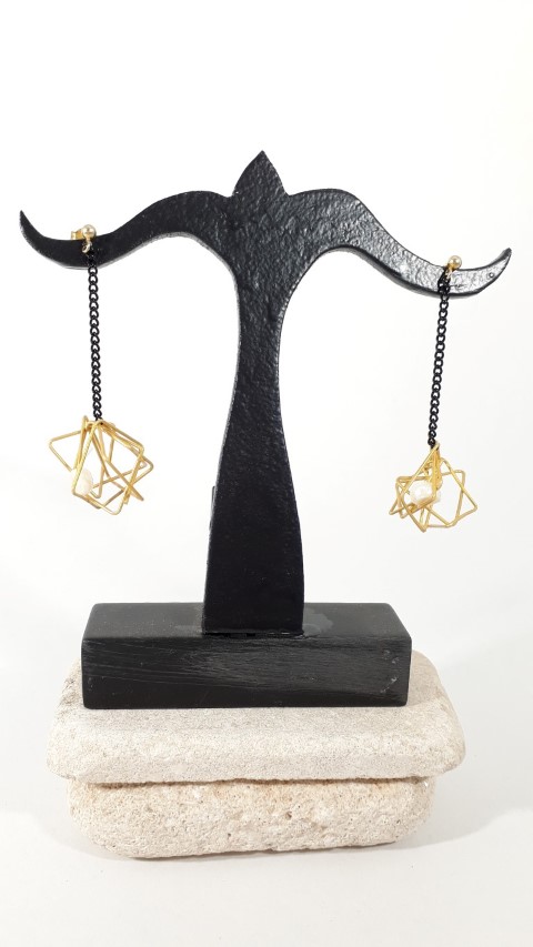Σκουλαρίκια κρεμαστά με καρφί από επίχρυσο ασήμι 925, μαύρη αλυσίδα από ατσάλι, ατσαλόσυρμα πλεγμένο σε μορφή μπάλας και μαργαριταράκι γλυκού νερού.