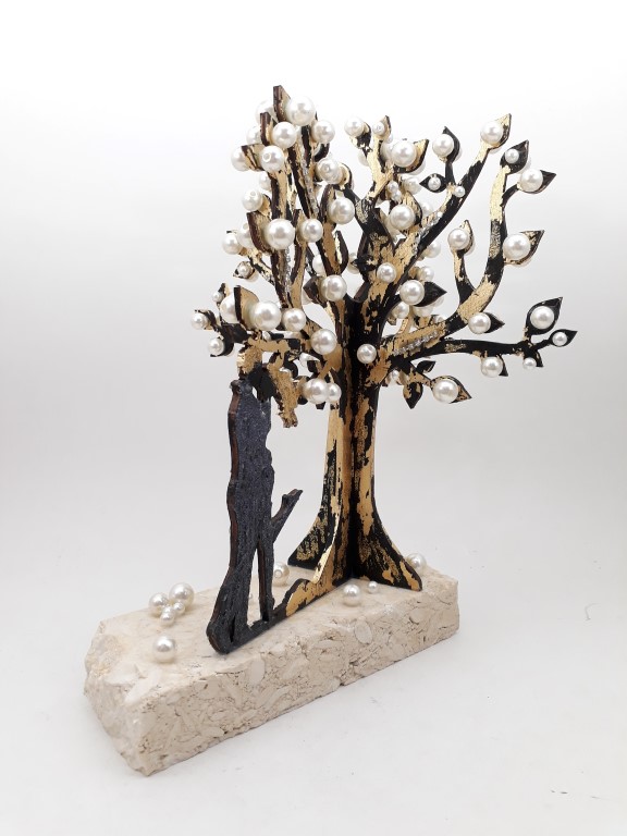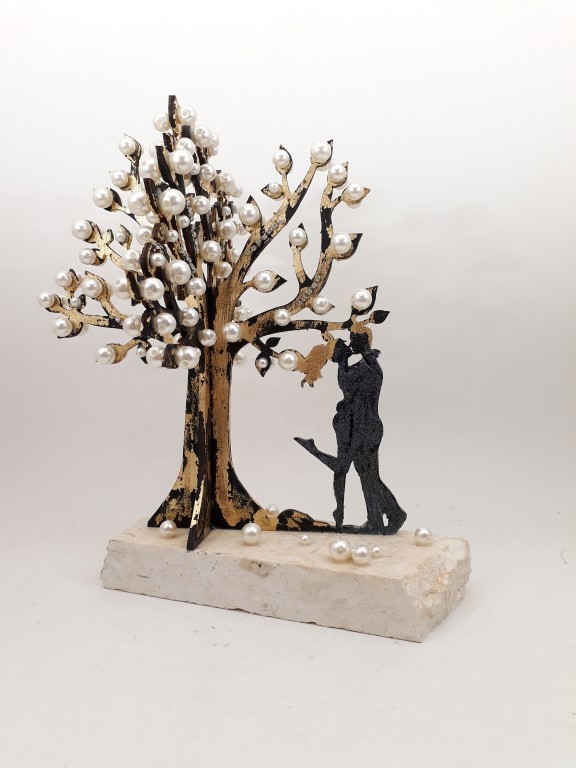 Χειροποίητο, τρισδιάστατο δέντρο από ξύλο σημύδας, περασμένο με φύλλα χρυσού και μαύρο χρώμα και στολισμένο με συνθετικές πέρλες. Το ζευγάρι είναι ζωγραφισμένο με μαύρα χρώματα. Κάθε δέντρο πατάει πάνω σε φυσικό μάρμαρο και είναι υπογεγραμμένο από τη δημιουργό του, Πηνελόπη.