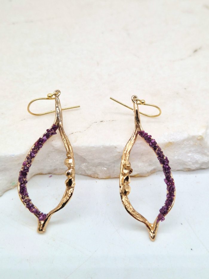 Σκουλαρίκια από ορείχαλκο με μοτίβο σαν μάτι διακοσμημένο με μωβ κρύσταλλα . Το κόσμημα είναι σκαλισμένο με διαμάντι που του προσδίδει ιδιαίτερες λάμψεις και παραμένει αναλλοίωτο στο χρόνο καθώς έχει εμβαπτιστεί σε ειδικά βερνίκια. Κούμπωμα κρεμαστό στο αφτί με επίχρυσο γάντζο απο ασήμι 925.